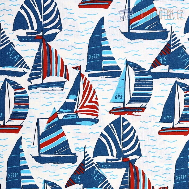 Příjemná bavlněná látka s plachetnicemi. Je poddajná, dobře se s ní pracuje. Má všestranné využití, oděvní i dekorační. Vhodná je například na polštáře, povlečení, sukně i bytové doplňky.