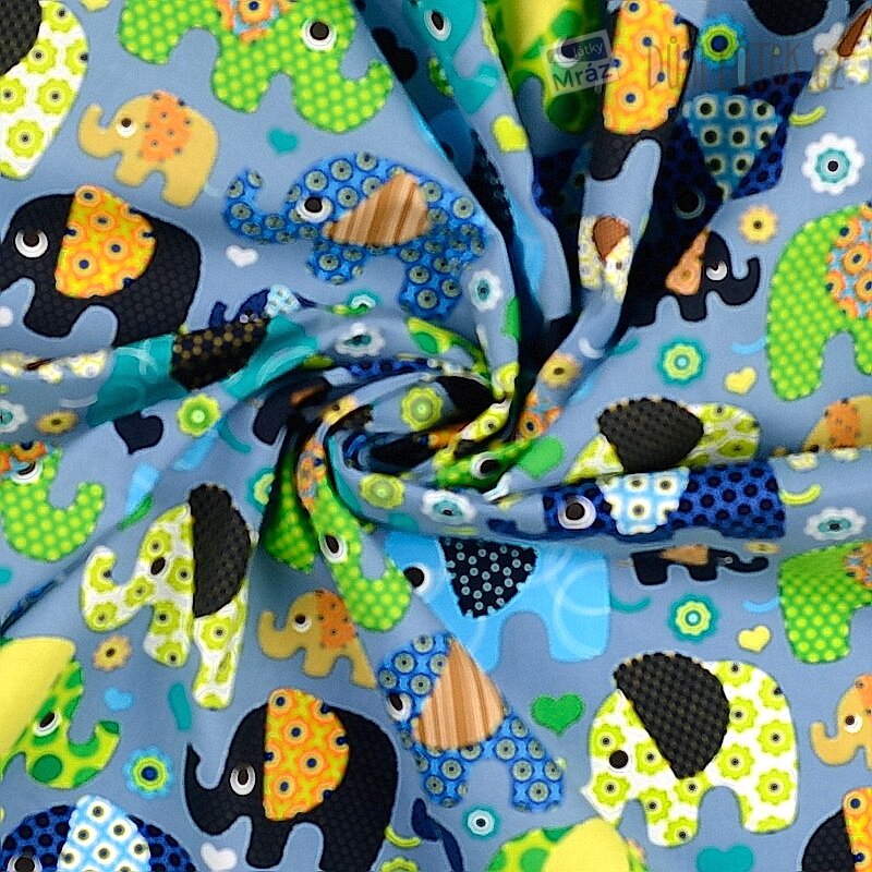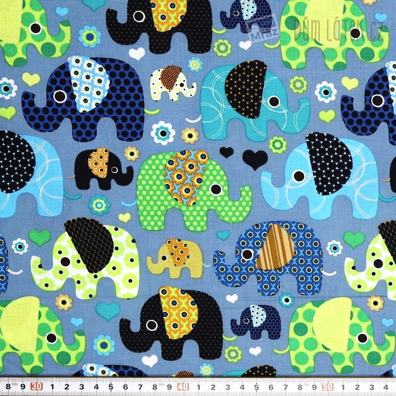 Bavlna s motivem slonů. Velmi příjemná na omak, poddajná, dobře se s ní pracuje, velmi jemná.
