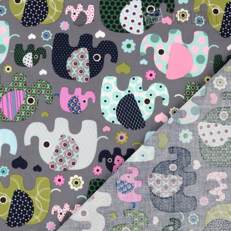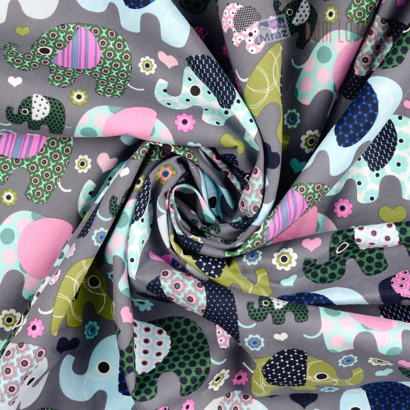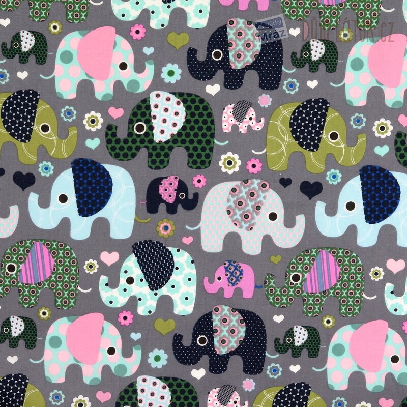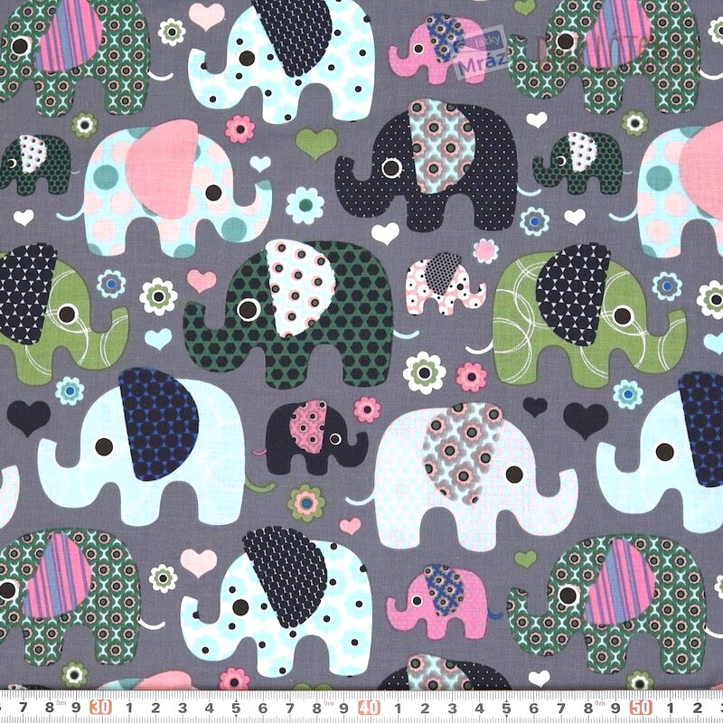 Bavlna s motivem slonů. Velmi příjemná na omak, poddajná, dobře se s ní pracuje, velmi jemná.