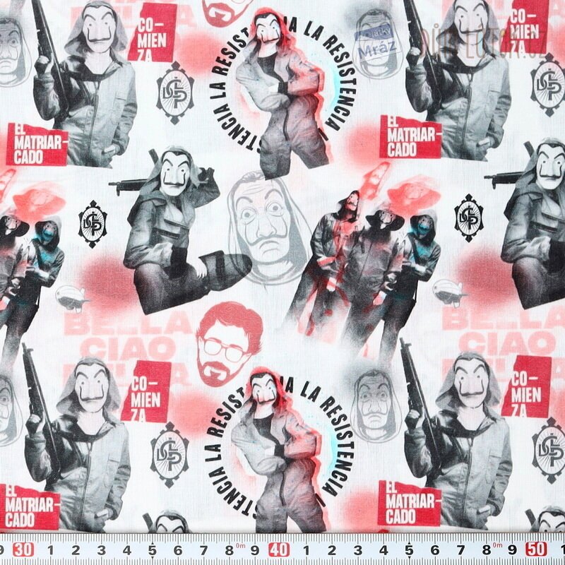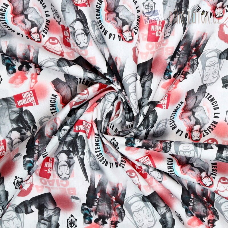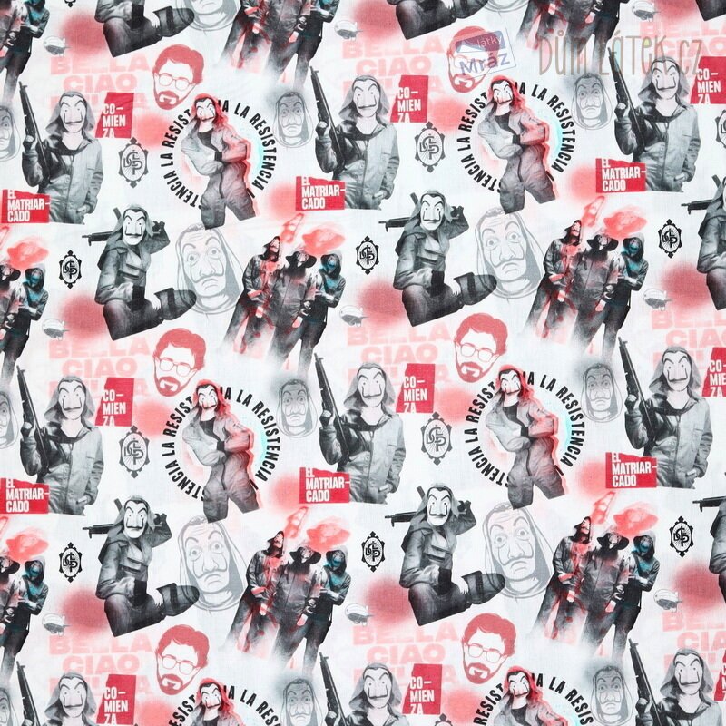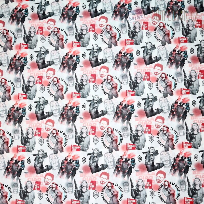 Příjemná bavlněná látka s motivem oblíbeného kresleného seriálu Papírový dům. Je poddajná, dobře se s ní pracuje. Má všestranné využití, oděvní i dekorační. Vhodná je například na polštáře, povlečení, sukně i bytové doplňky.