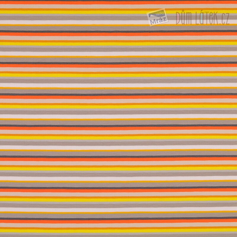 Krásný a příjemný úplet s pruhy. Látka je hladká a poddajná, proto se s ní snadno pracuje. Vhodný na trička, mikiny, šaty, legíny, čepice či jiný oděv.