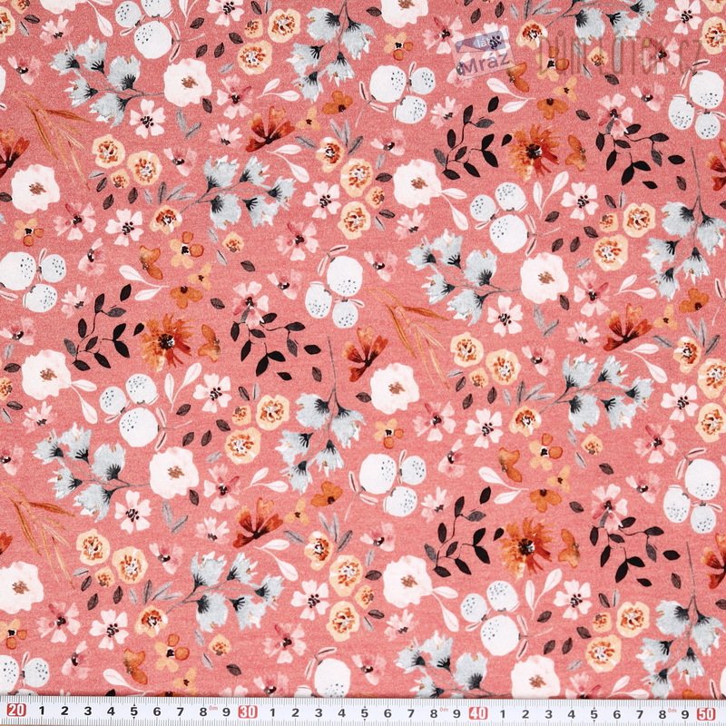 Krásný a příjemný bavlněný bio úplet s digitálním postiskem květů. Látka je hladká a poddajná, proto se s ní snadno pracuje. Vhodný na trička, mikiny, šaty, legíny, čepice či jiný oděv.