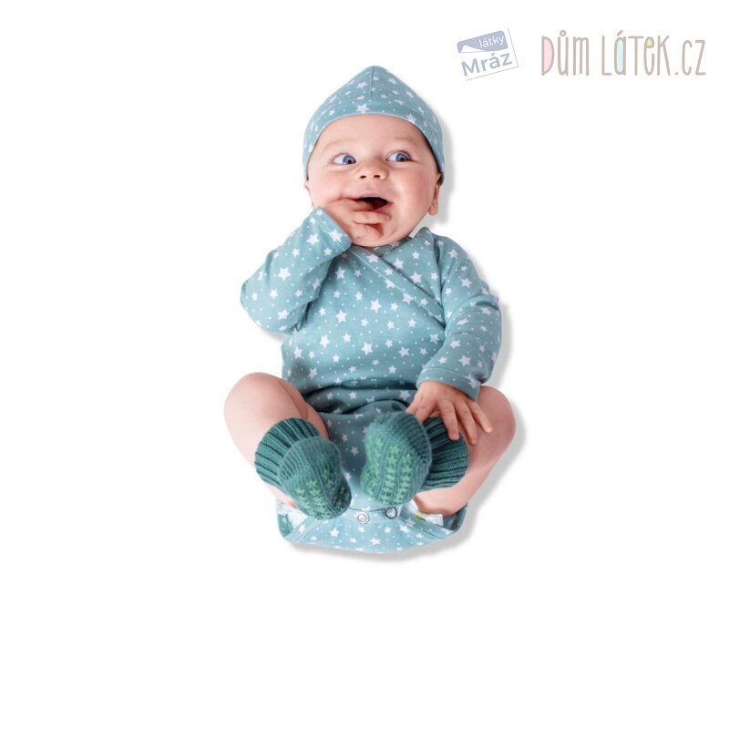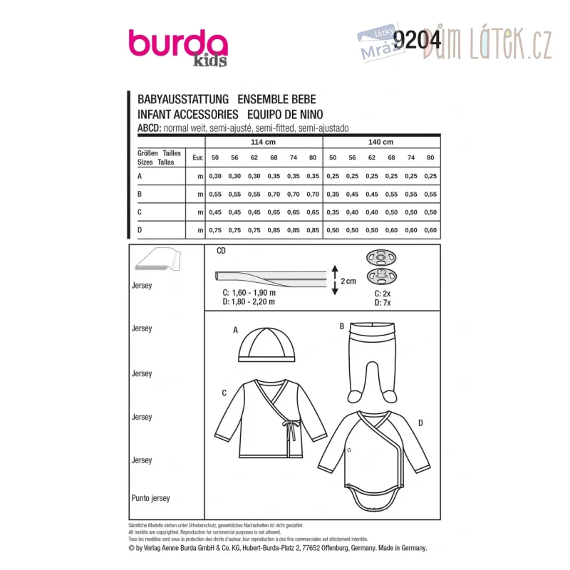 Obsahuje 4 střihy na výbavičku pro novorozence - dětský kabátek, kalhoty, body a čepici.