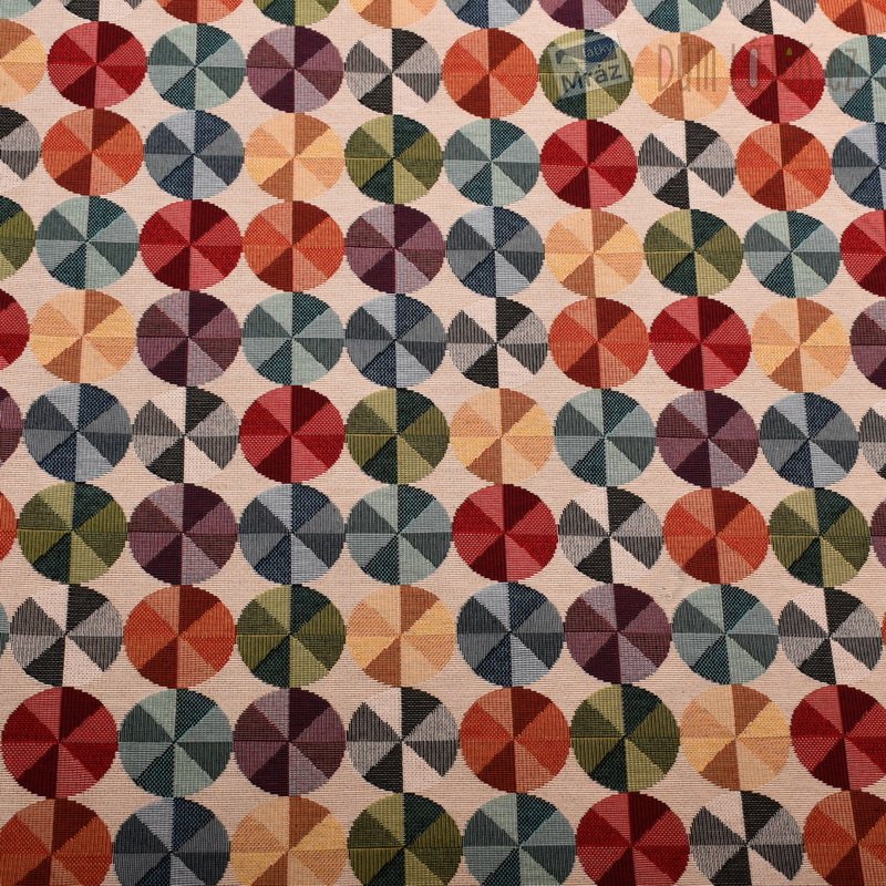 Designová gobelínová látka s kolečky. Je díky své vyšší gramáži a pevnosti vhodná převážně na dekorace - polštáře, tašky, potahy, závěsy.
