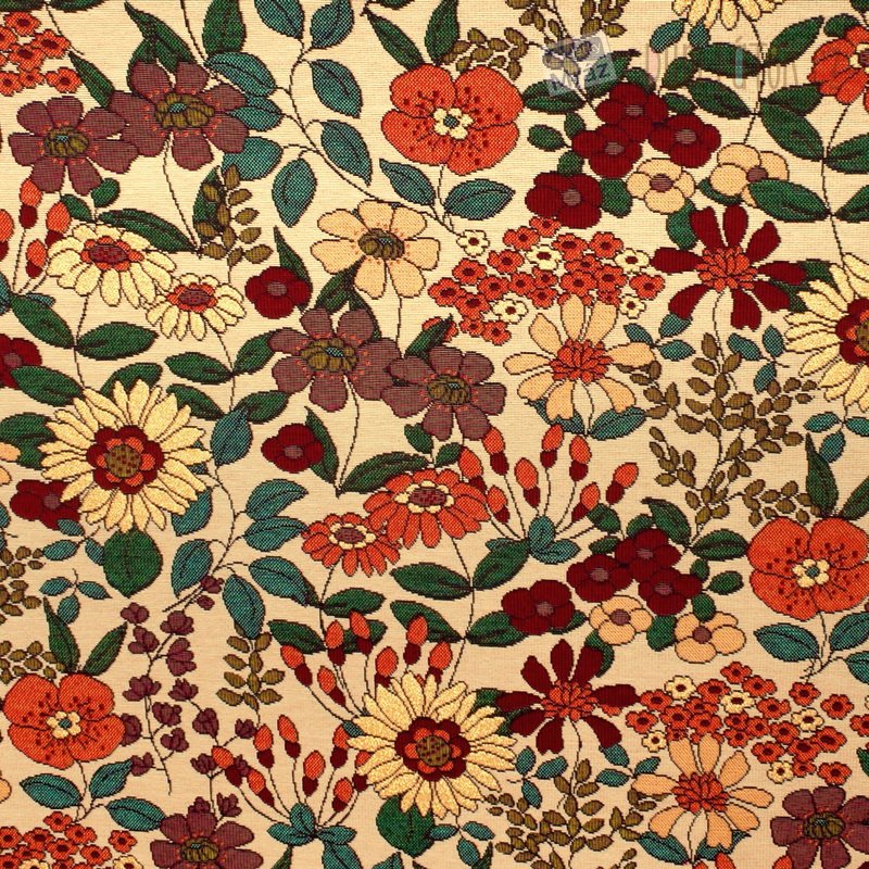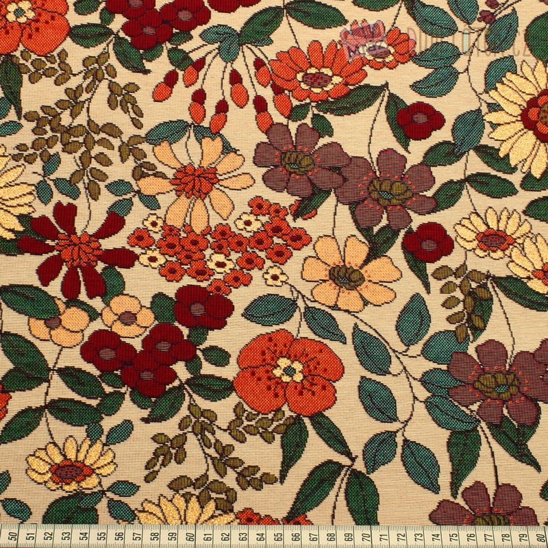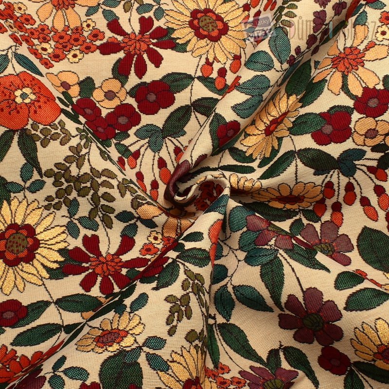 Designová gobelínová látka s květy. Je díky své vyšší gramáži a pevnosti vhodná převážně na dekorace - polštáře, tašky, potahy, závěsy.