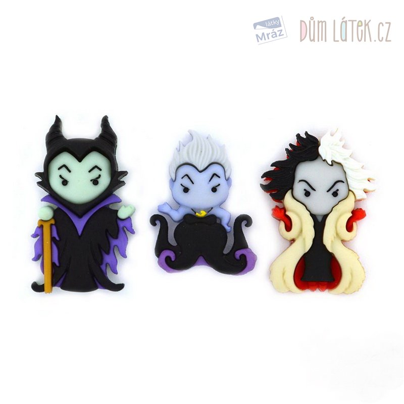 Dekorační knoflíčky se zápornými postavičkami z Disney pohádek - Uršula, Kruela a Zloba. Vhodné pro scrapbook a další dekorace. Např. dozdobení oblečení, tašek či šperků.