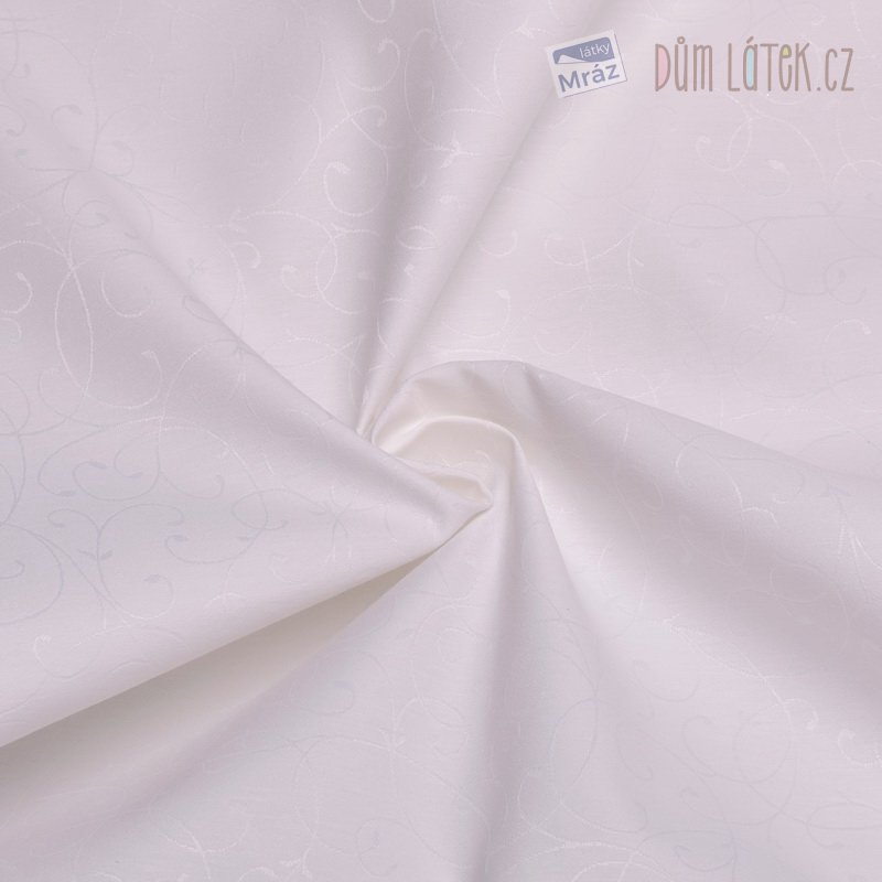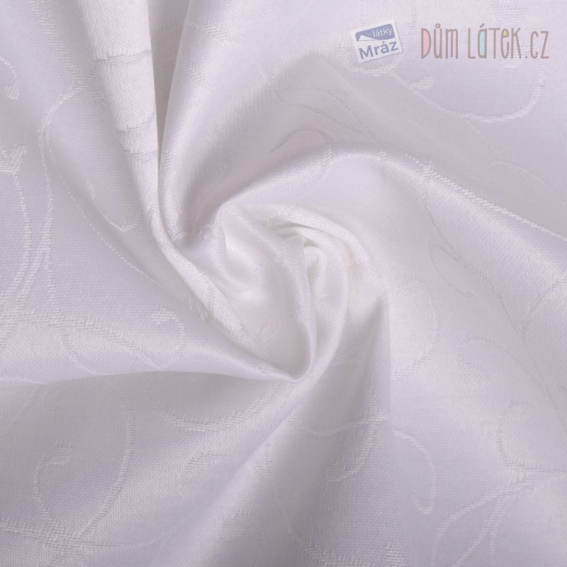 Oboustranná dekorační látka v krémové barvě s jemným vyšívaným vzorem. Látka je matná z jedné a lesklá z druhé strany.