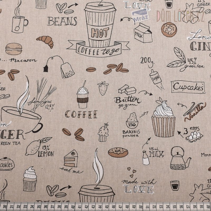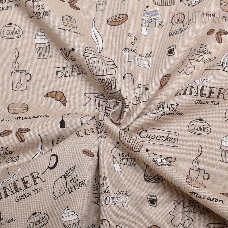 Dekorační látka s kávou na režném podkladu. Látka je hladká a je vhodná na dekorační účely, jako jsou polštářky, ubrusy, taštičky a jiné vánoční dekorace.