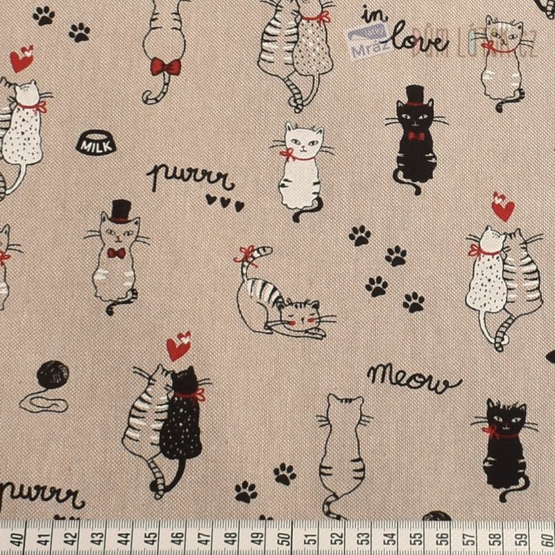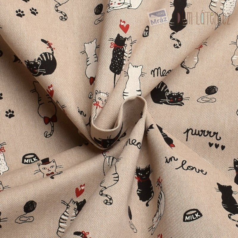 Dekorační látka s kočkami na režném podkladu.