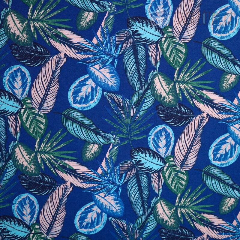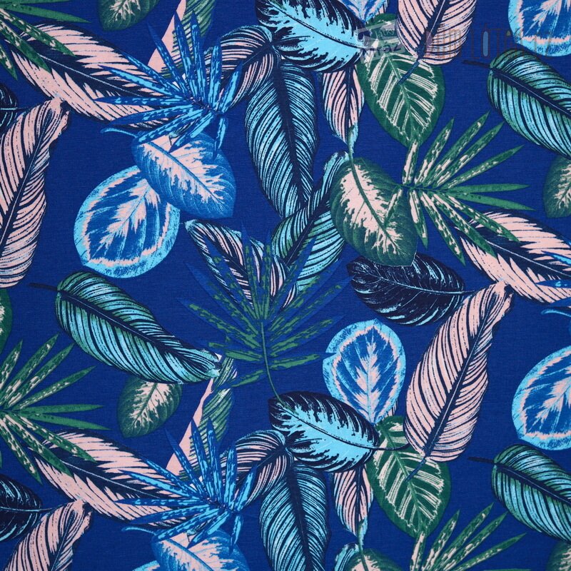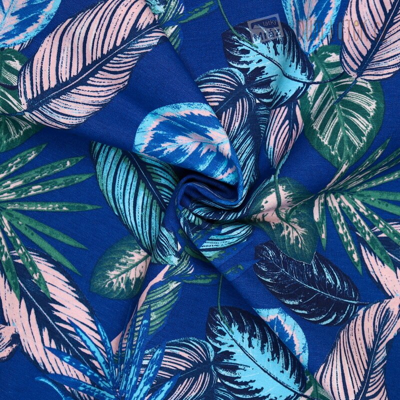 Dekorační látka s listy na modrém podkladu.