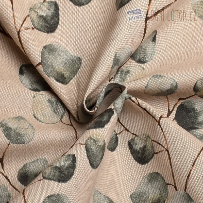Dekorační látka s listy eukalyptu na režném podkladu.