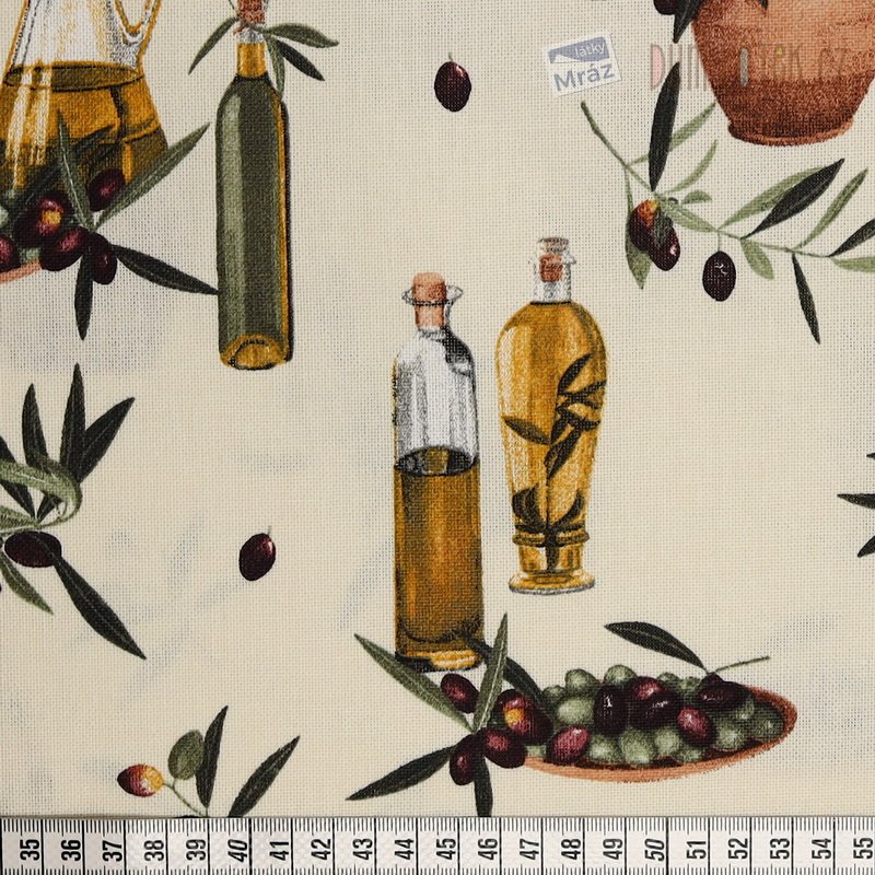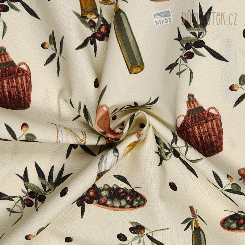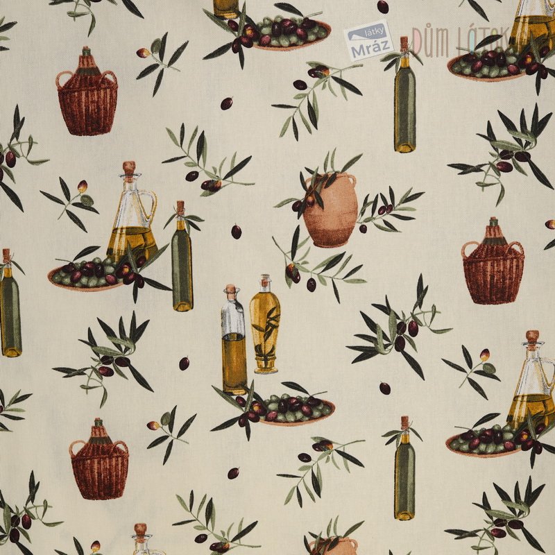 Dekorační látka s olivami na smetanovém podkladu.