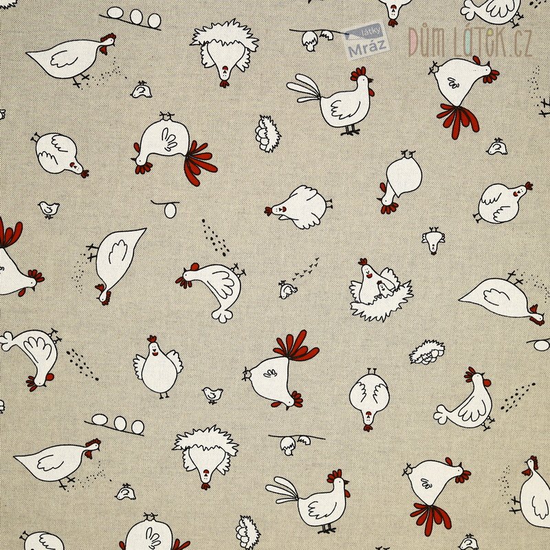 Dekorační látka se slepicemi na režném podkladu.