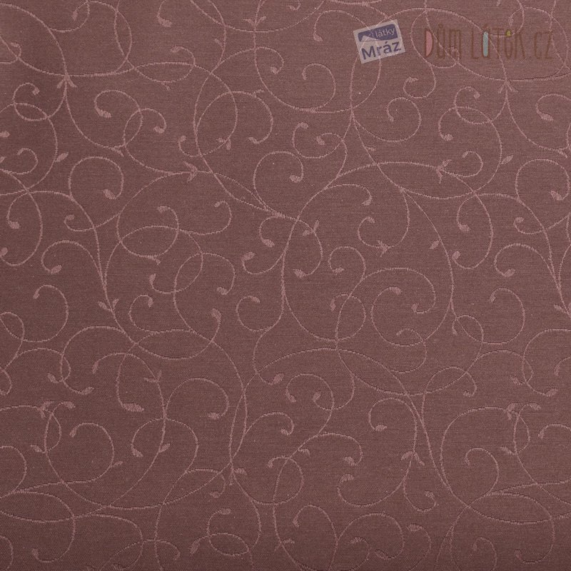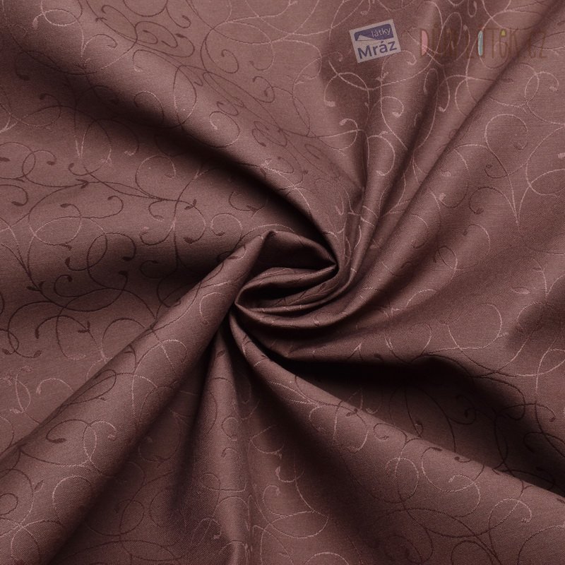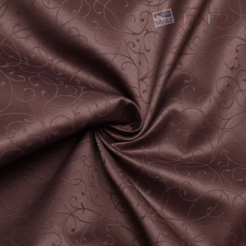 Oboustranná dekorační látka v hnědý barvě s jemným vyšívaným vzorem. Látka je matná z jedné a lesklá z druhé strany.