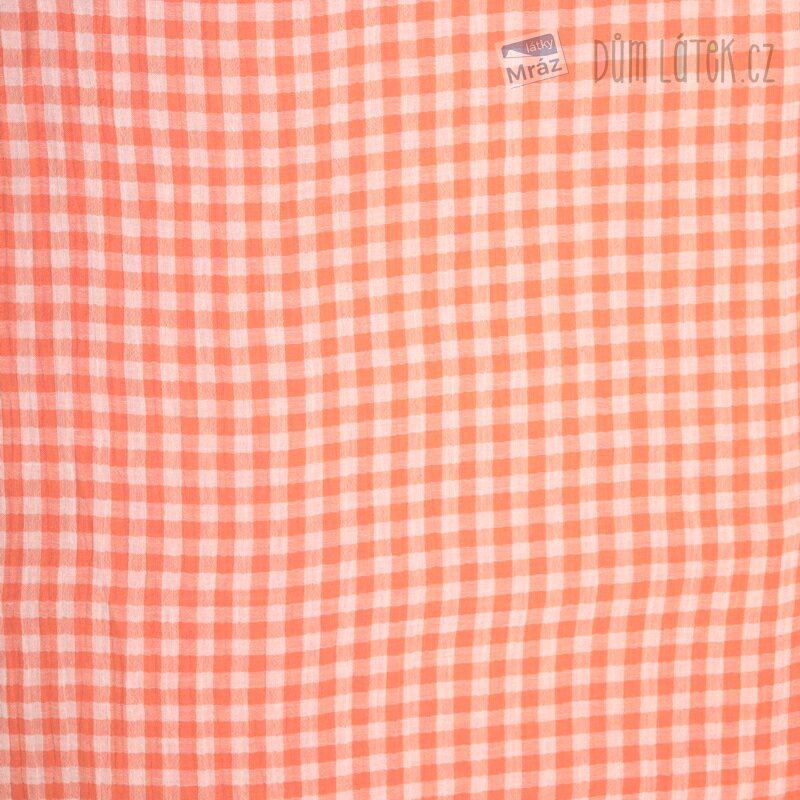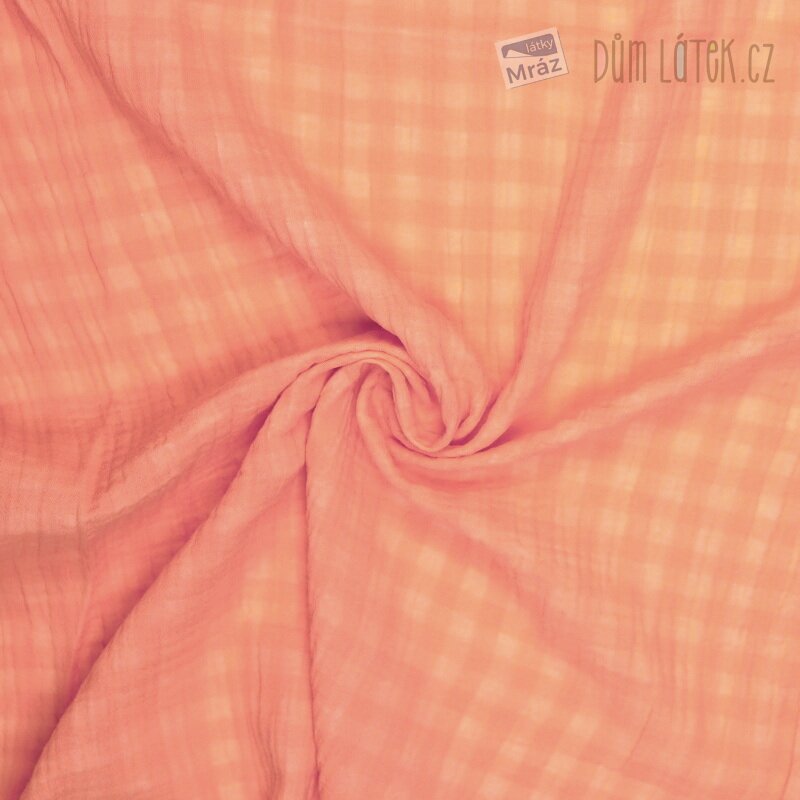 Dvojitá oranžovo-bílá gázovina. Látka je lehká, příjemná na omak, měkká, poddajná, vhodná na letní šaty, sukně, košile, kalhoty.