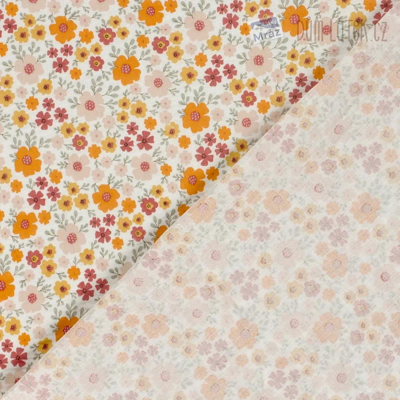 Dvojitá gázovina s květy. Látka je lehká, příjemná na omak, měkká, poddajná, vhodná na letní šaty, sukně, košile, kalhoty.