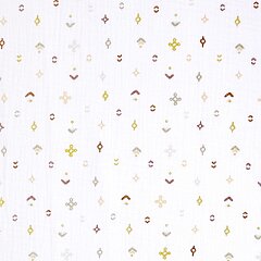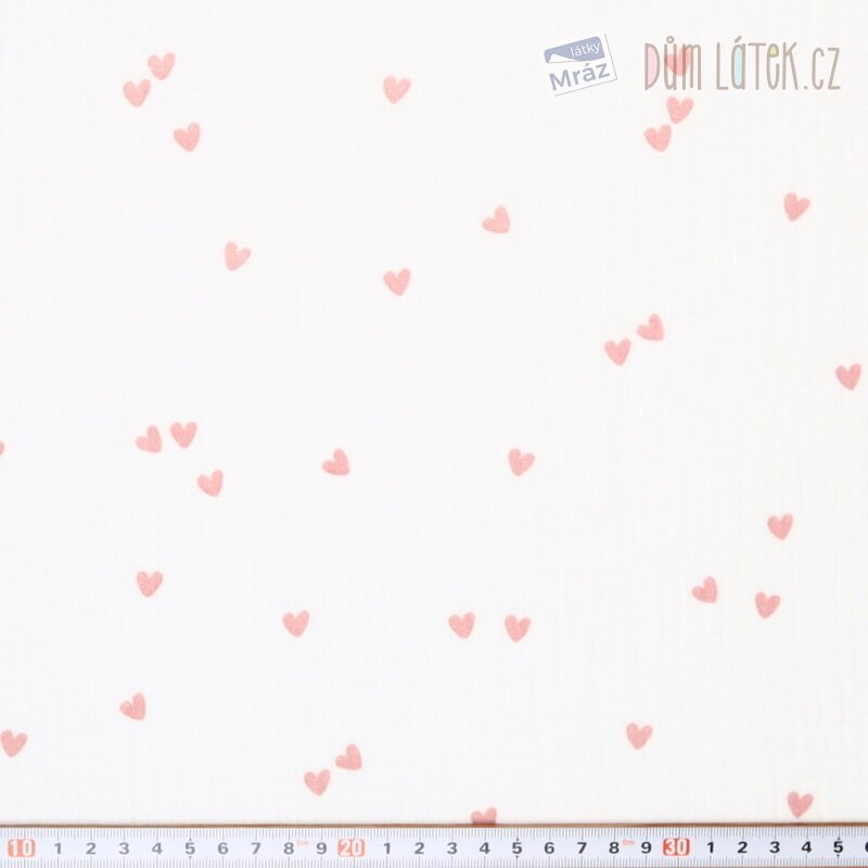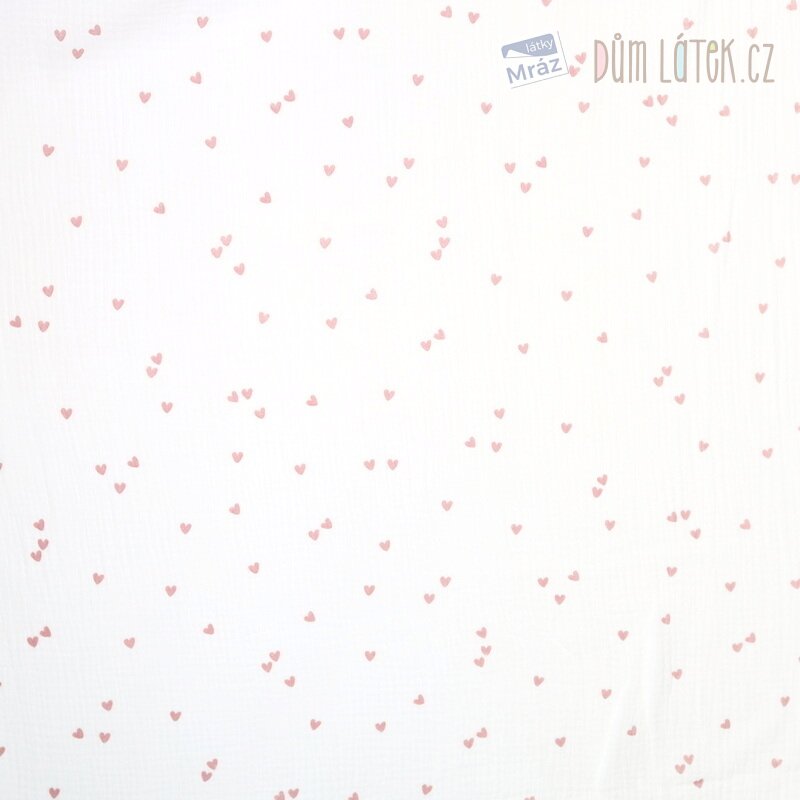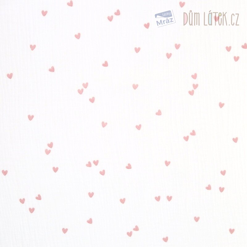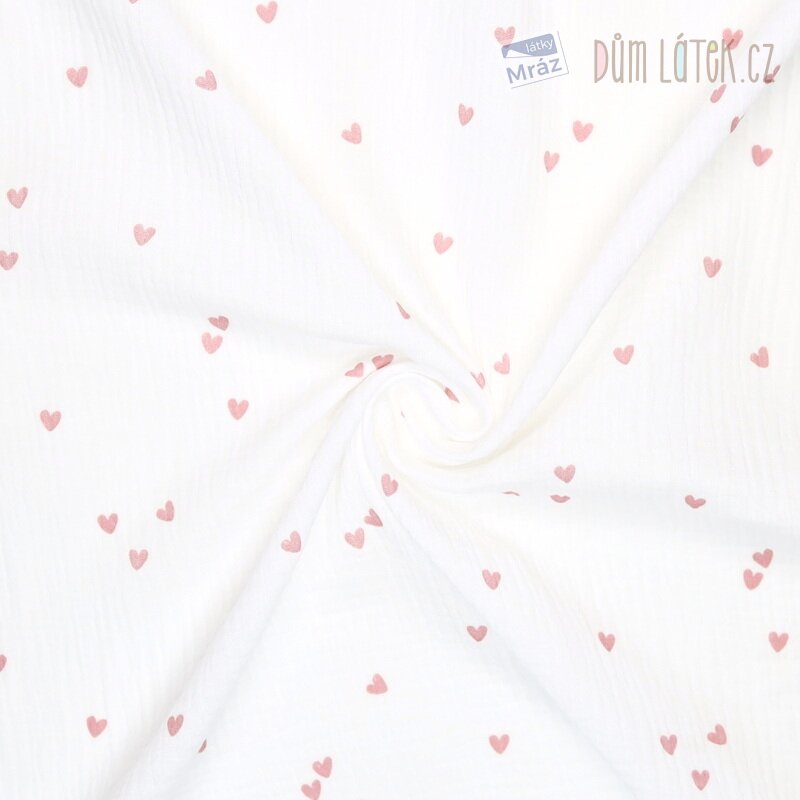 Dvojitá gázovina v bílé barvě se srdíčky. Látka je lehká, příjemná na omak, měkká, poddajná, vhodná na letní šaty, sukně, košile, kalhoty.