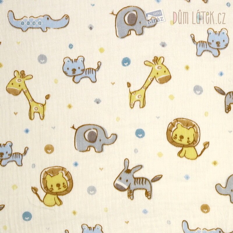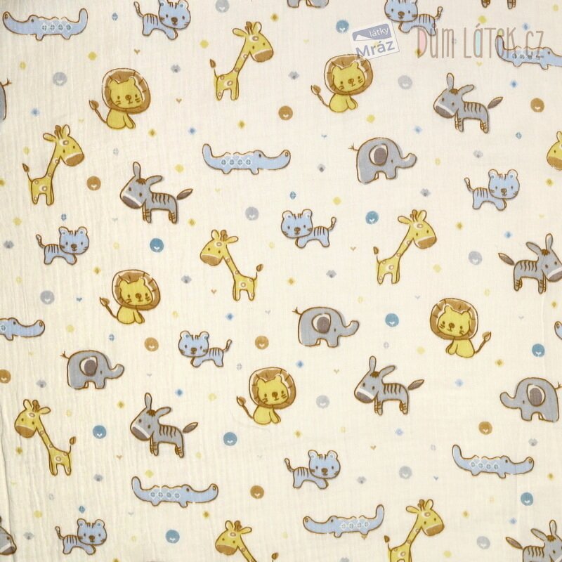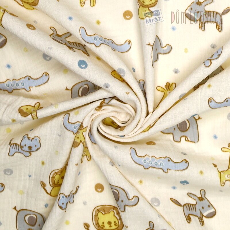 Dvojitá gázovina se zvířátky. Látka je lehká, příjemná na omak, měkká, poddajná, vhodná na letní šaty, sukně, košile, kalhoty.