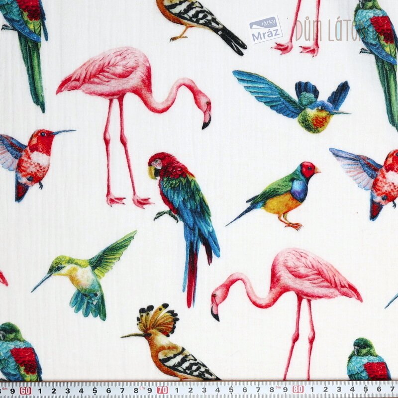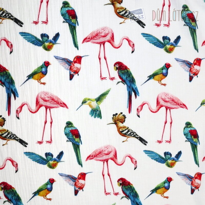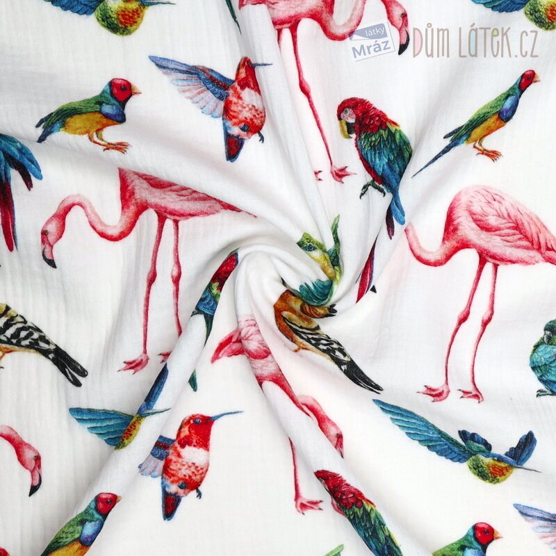 Dvojitá gázovina se zvířátky. Látka je lehká, příjemná na omak, měkká, poddajná, vhodná na letní šaty, sukně, košile, kalhoty.