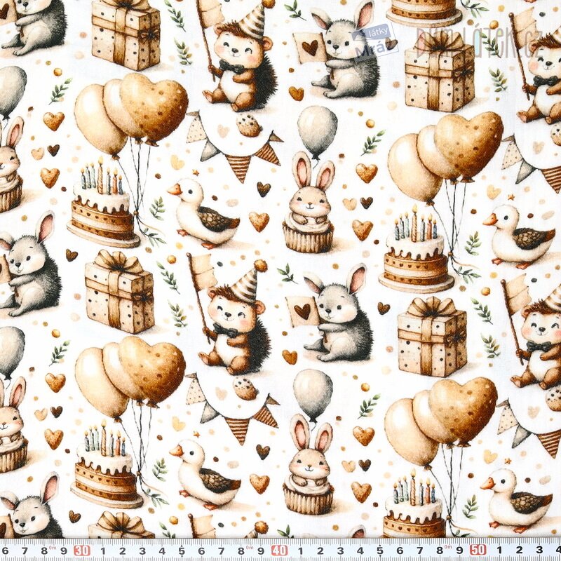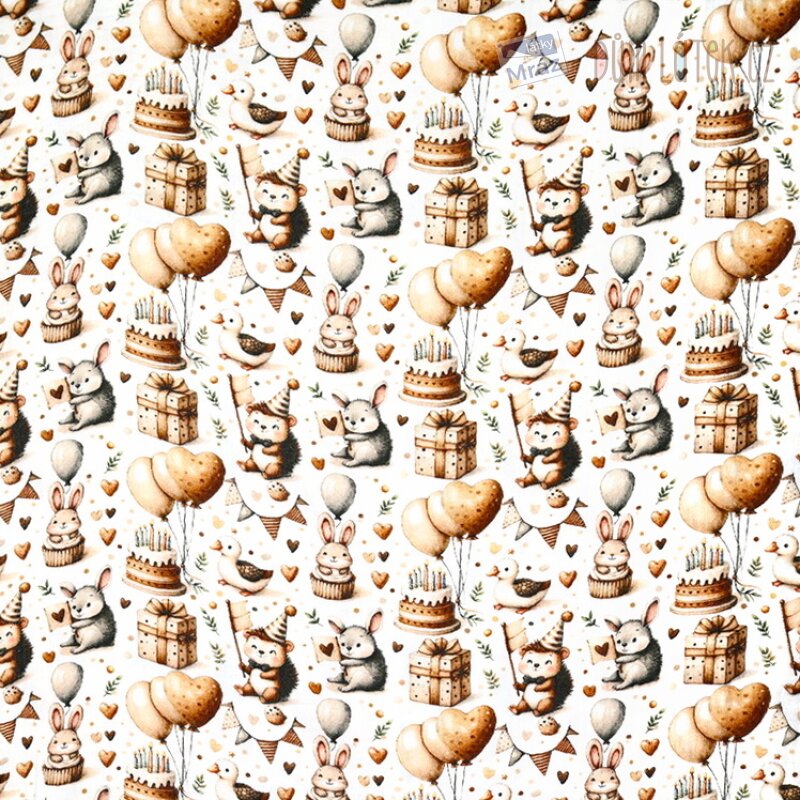 Dvojitá gázovina se zvířátky - narozeninová párty. Látka je lehká, příjemná na omak, měkká, poddajná, vhodná na letní šaty, sukně, košile, kalhoty.