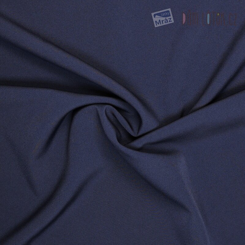 Kostýmová strečová látka s jemnou strukturou v tmavě modré barvě je příjemná, pevná a pružná převážně po šířce.