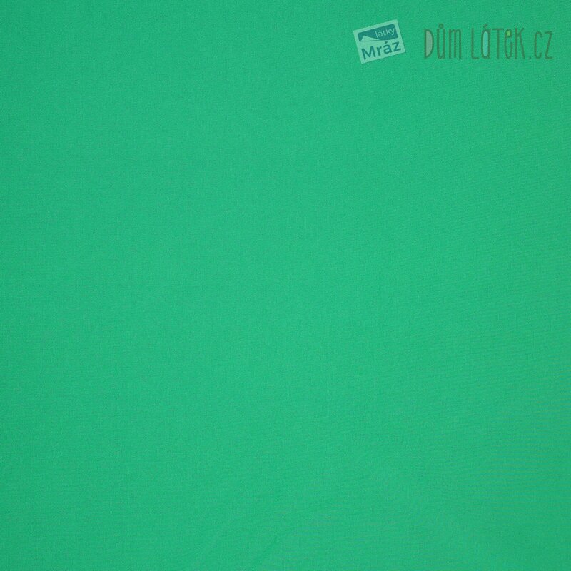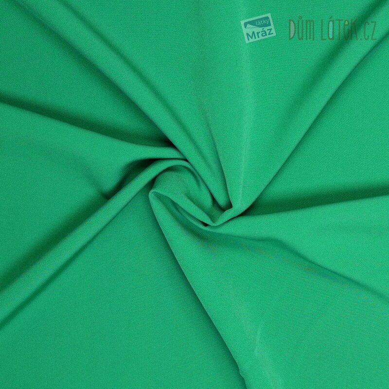 Kostýmová strečová látka s jemnou strukturou v zelené barvě je příjemná, pevná a pružná převážně po šířce.