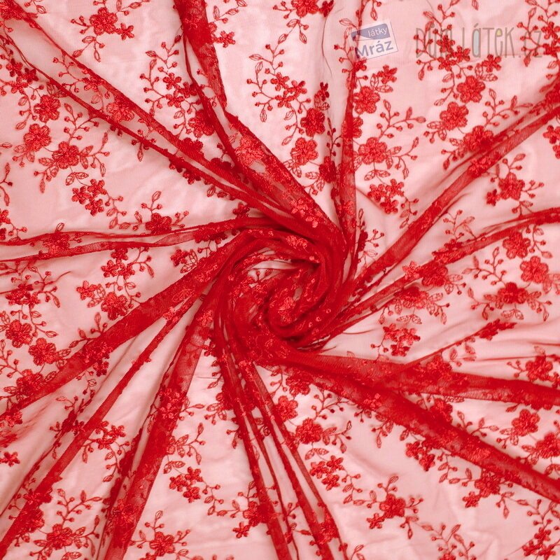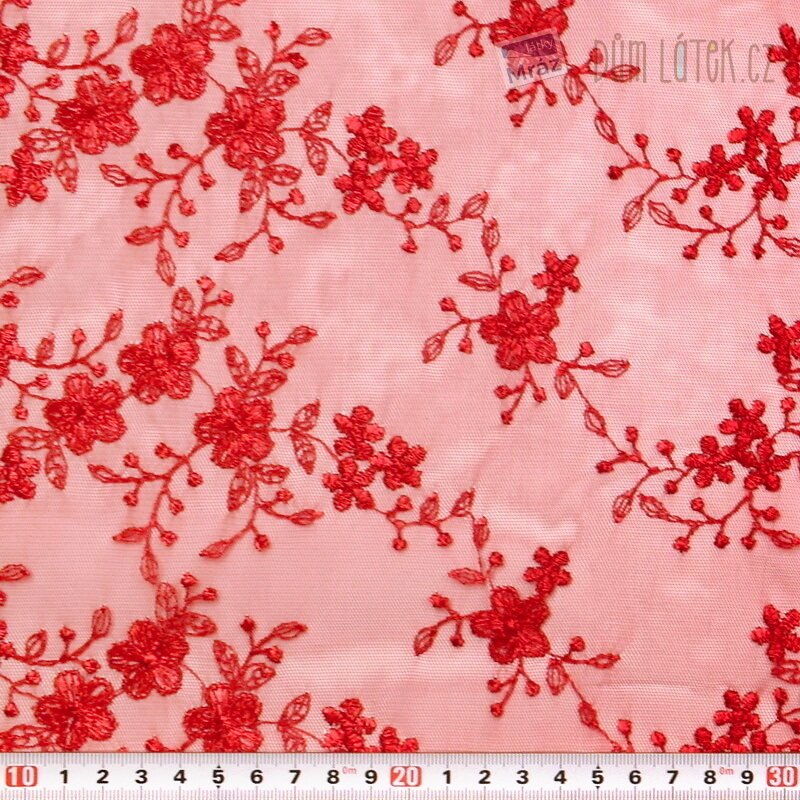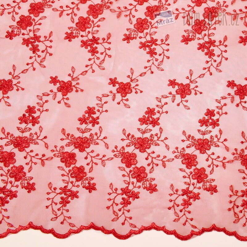 Krajka s květy v červené barvě. Ideálně ji lze využít na sukně, šaty či jako zdobné prvky oděvu.