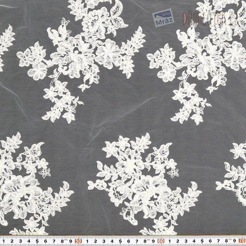 Jemná a nádherná metrážová krajka s výšivkou ve smetanové barvě s květy. Krajka je měkká, vhodná na šaty, sukně, topy, body, ale i na různé dekorační účely.