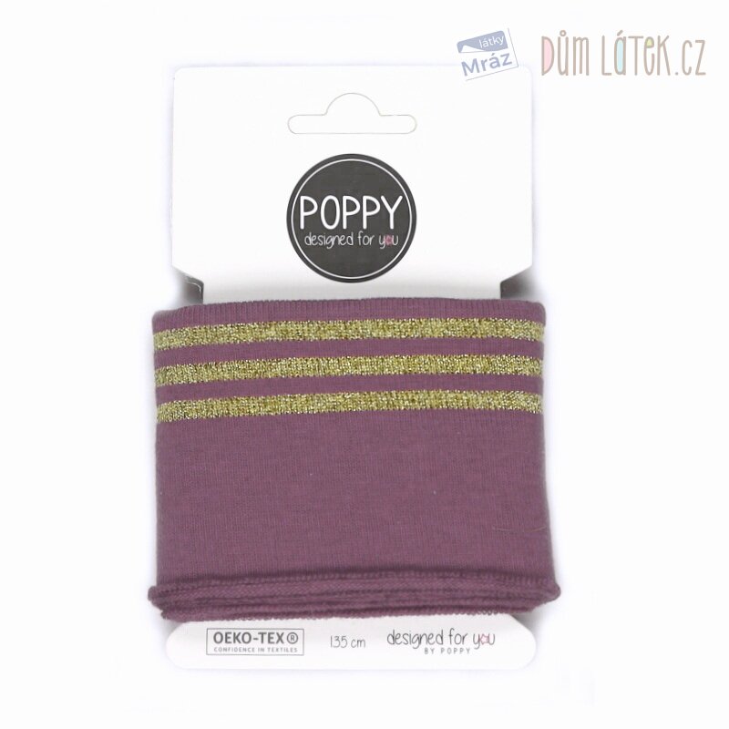 Oboulícní náplet s proužky ve fialové barvě se zlatým lurexem je příjemný a pružný materiál ideální pro lemování mikin, kalhot, tepláčků či bundiček.