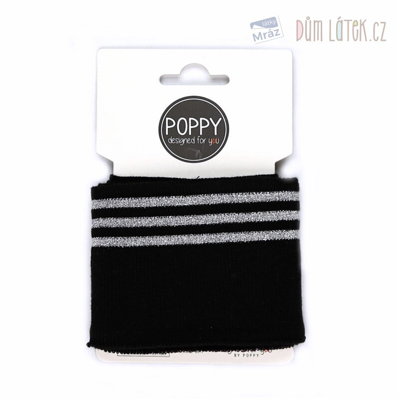 Oboulícní náplet s proužky v černé barvě se stříbrným lurexem je příjemný a pružný materiál ideální pro lemování mikin, kalhot, tepláčků či bundiček.