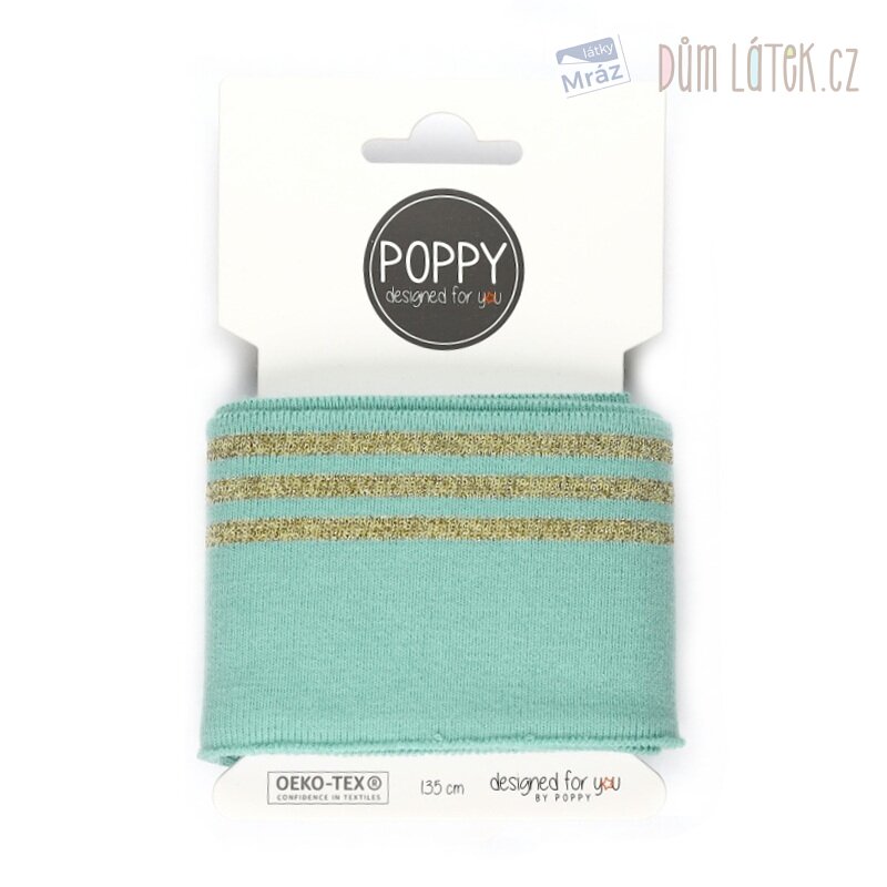 Oboulícní náplet s proužky v mint barvě se zlatým lurexem je příjemný a pružný materiál ideální pro lemování mikin, kalhot, tepláčků či bundiček.
