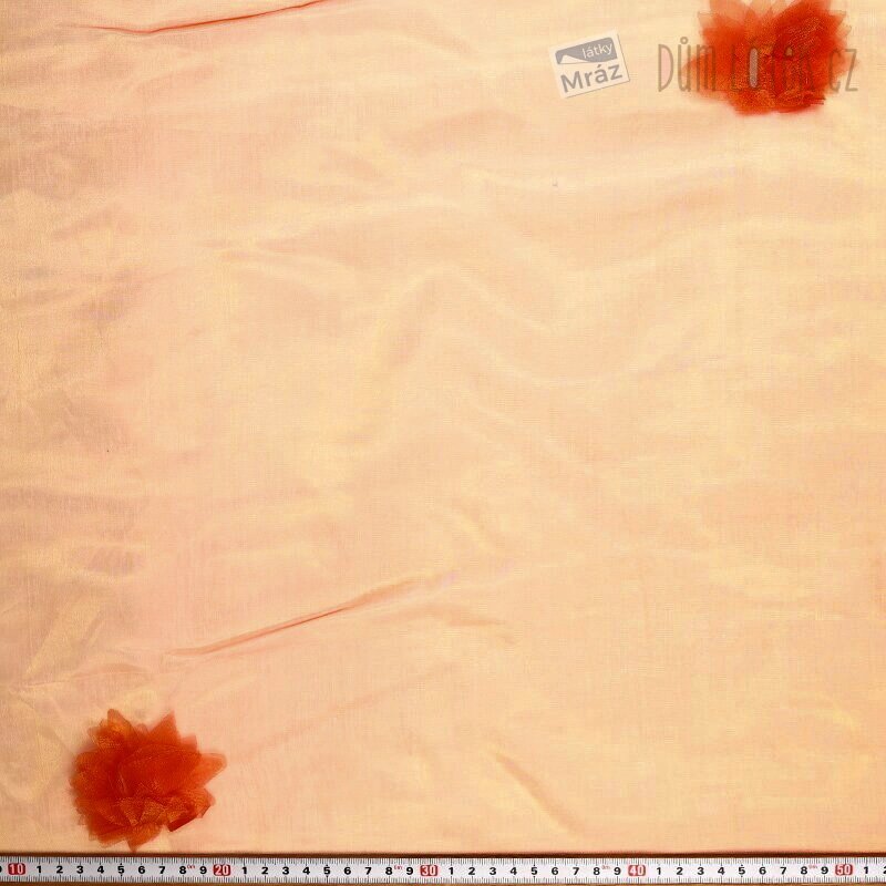 Organza s květinovou aplikací je lehká a průhledná. Vhodná převážně k dekoračním účelům. Využijete ji například na výrobu různých bytových dekorací.