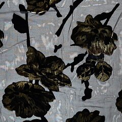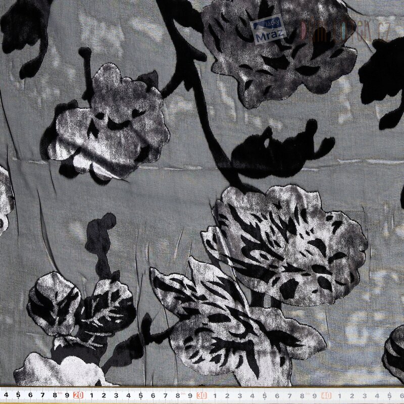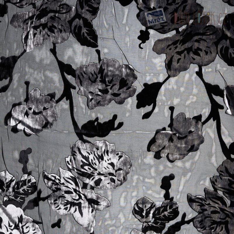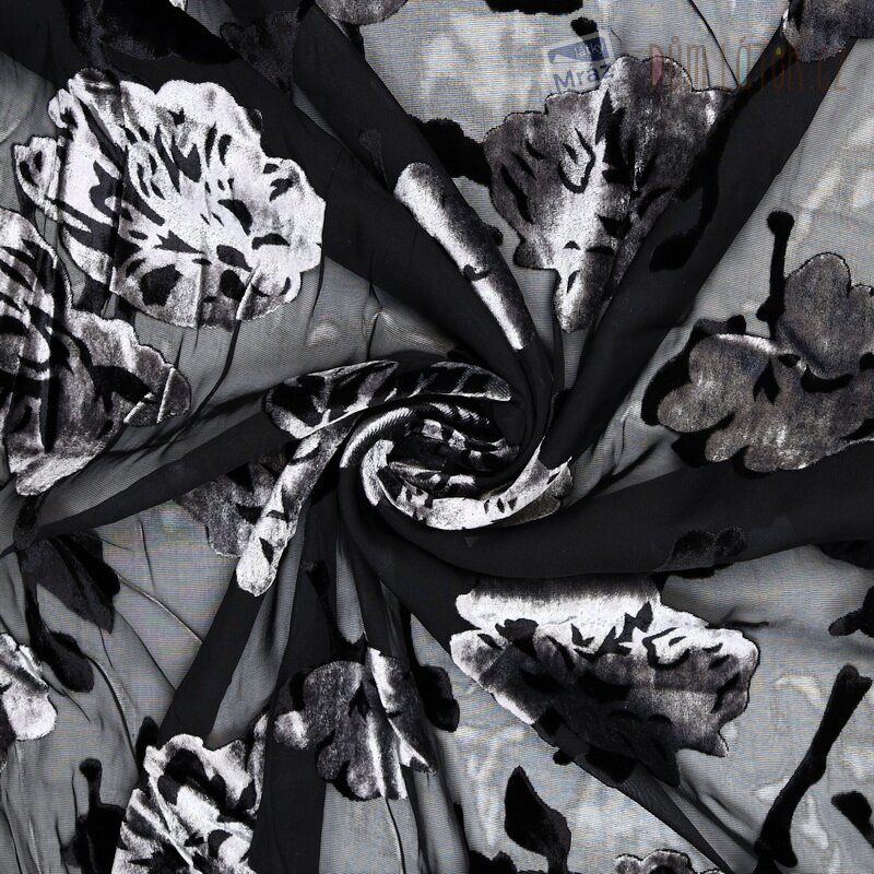 Šifon je lehká hladká splývavá látka. Je průhledný, při použití na oděvy ji doporučujeme podšít. Látka má na sobě tzv. vypalovaný vzor (také ausbrenner nebo devoré), který působí jako sametová plastická aplikace. Tento černý šifon má na sobě sametové květy v šedé barvě, které díky lesku vypadají stříbrně.
