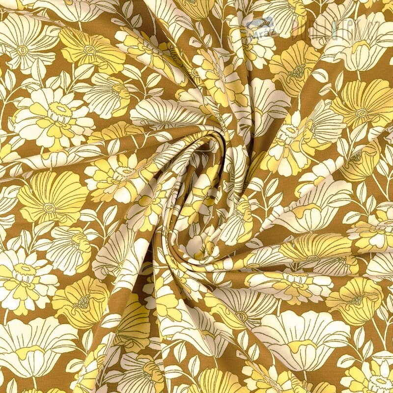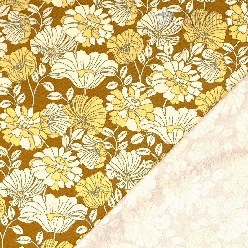Krásný měkký úplet s květy. Látka je hladká a poddajná, proto se s ní snadno pracuje.