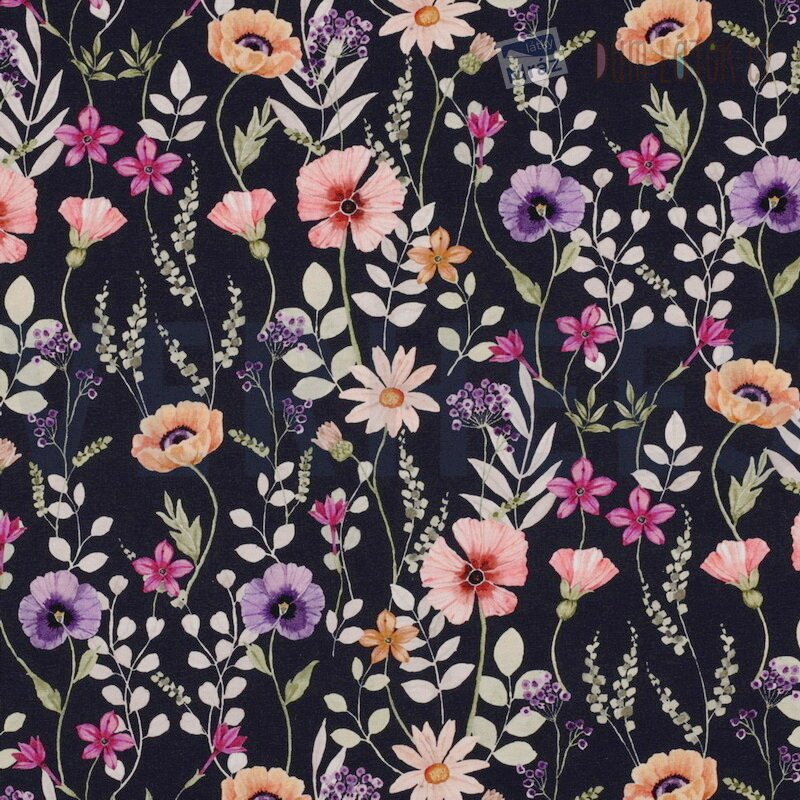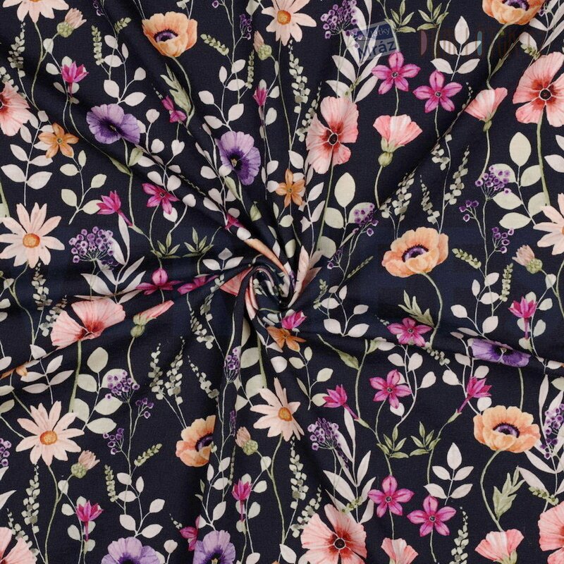 Krásný a příjemný úplet s květy. Látka je hladká a poddajná, proto se s ní snadno pracuje. Vhodný na trička, mikiny, šaty, legíny, čepice či jiný dětský oděv.