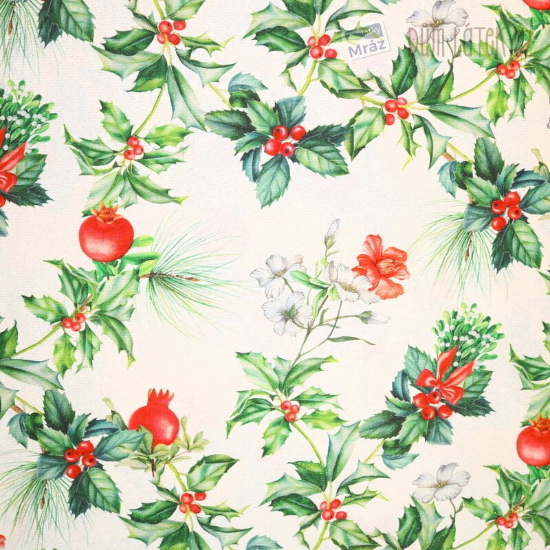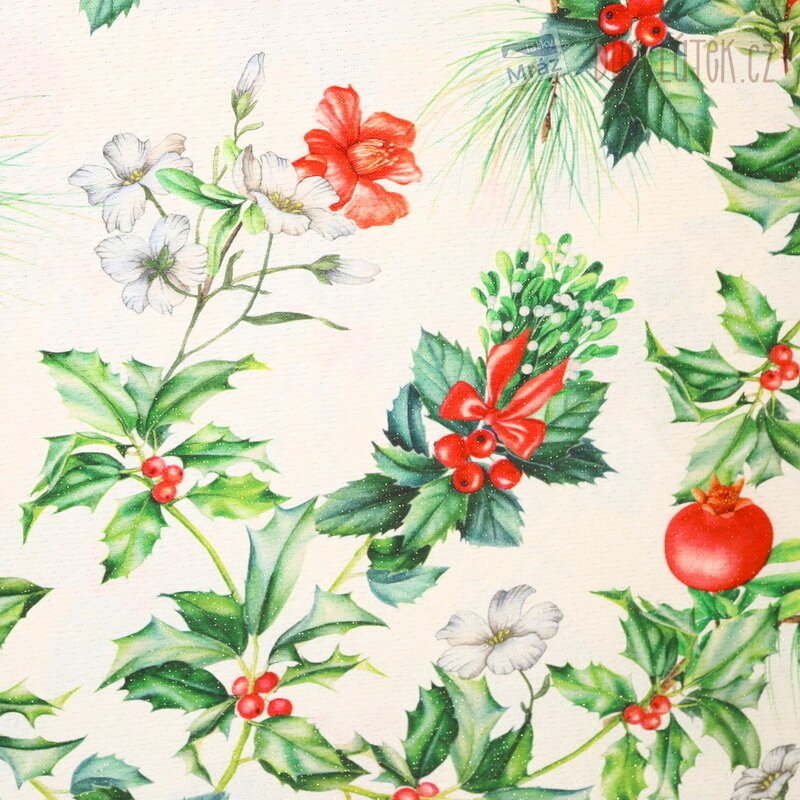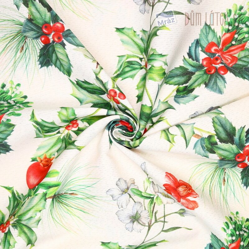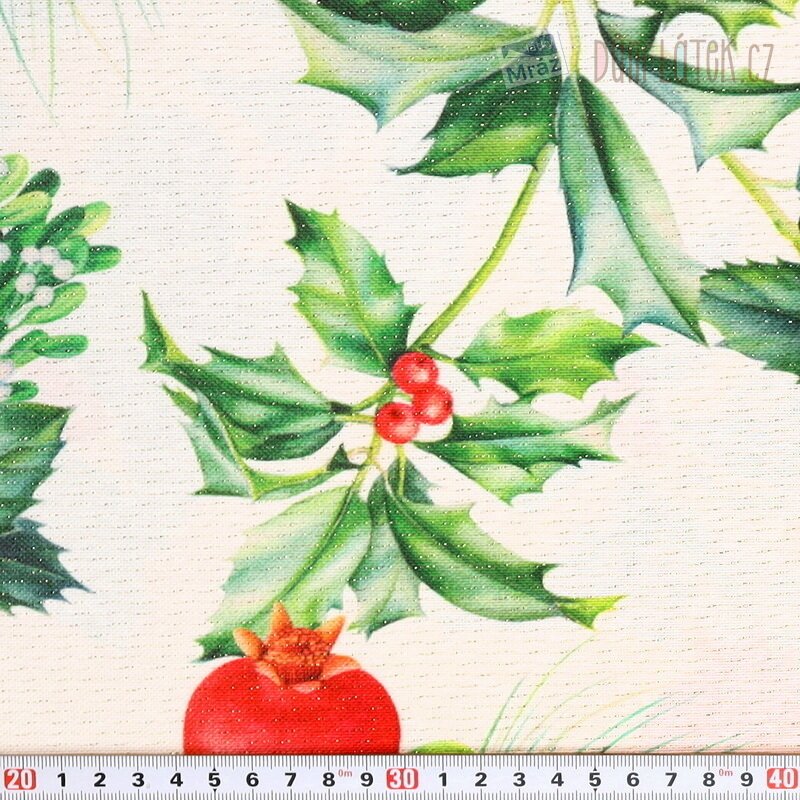Vánoční dekorační látka s cesmínou a lurexem, digitální tisk
