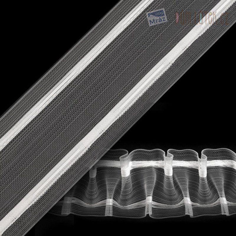 Čirá, pravidelně řasená záclonová stuha, tvarující záclonu do speciálního dvojitého tužkového řasení (žabkové řasení). Po našití a nařasení připevníte záclonu či závěs pomocí háčků nebo kolíčků s využitím kapsiček vetkaných do stuhy. Doporučené řasení 1:2,25.