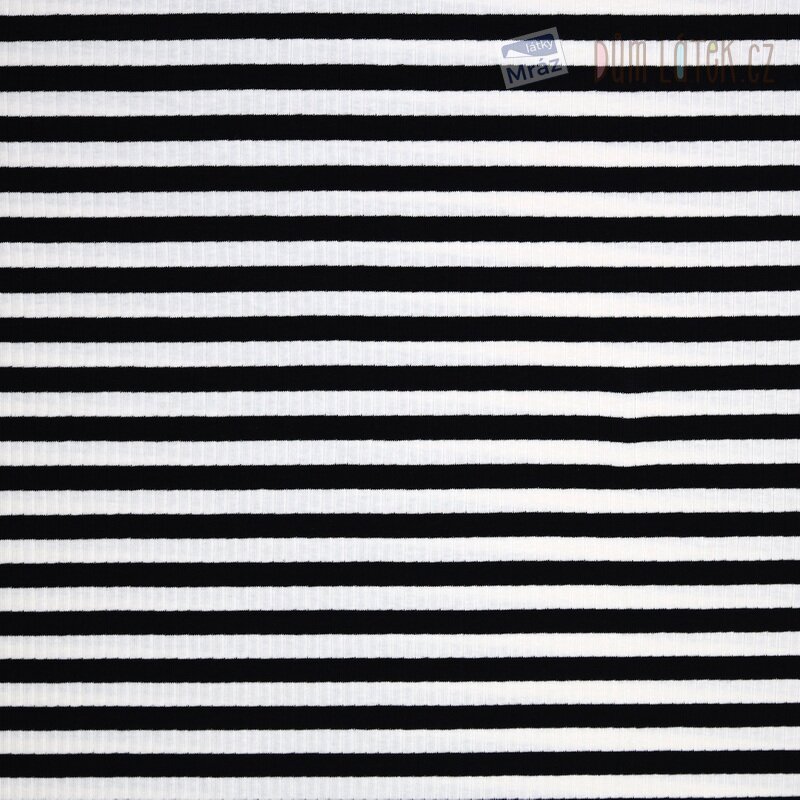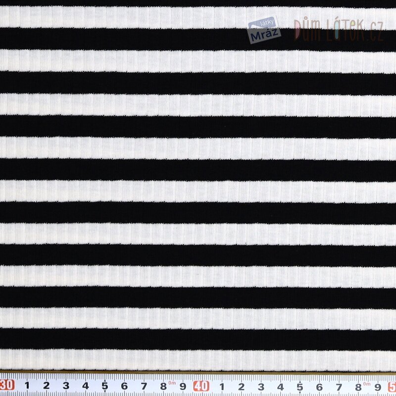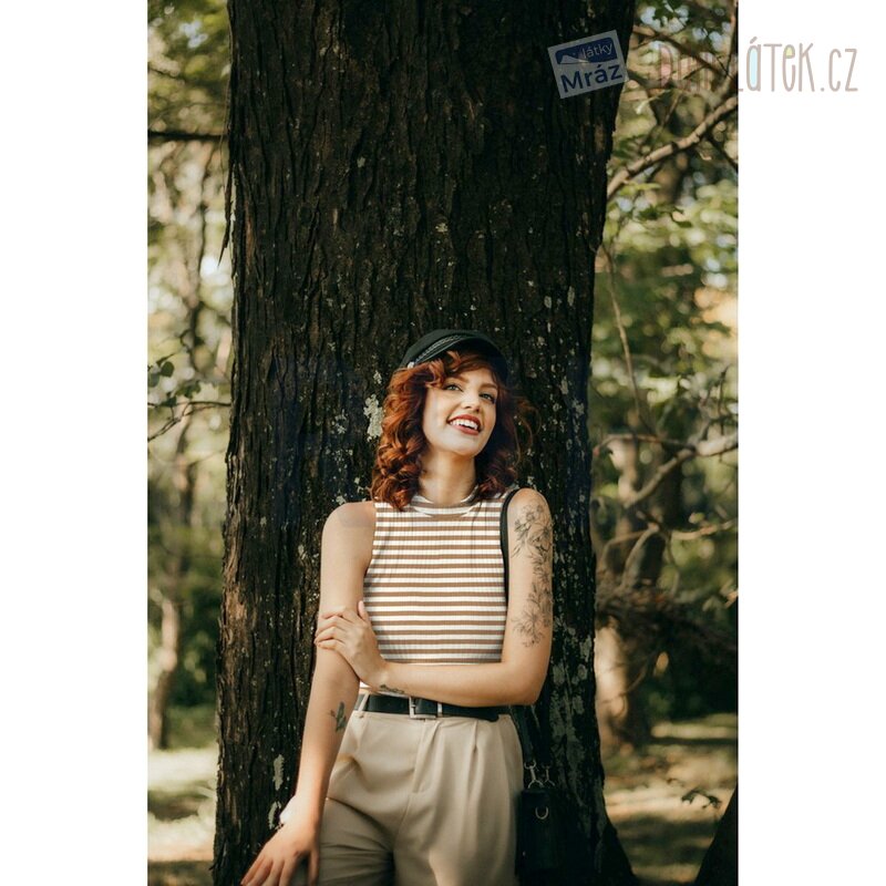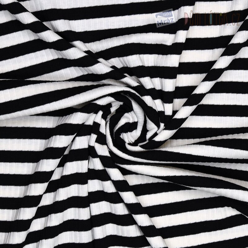 Jemný a příjemný úplet s pruhy a žebrováním. Látka je elastická, hladká a poddajná,tudíž se s ní snadno pracuje.